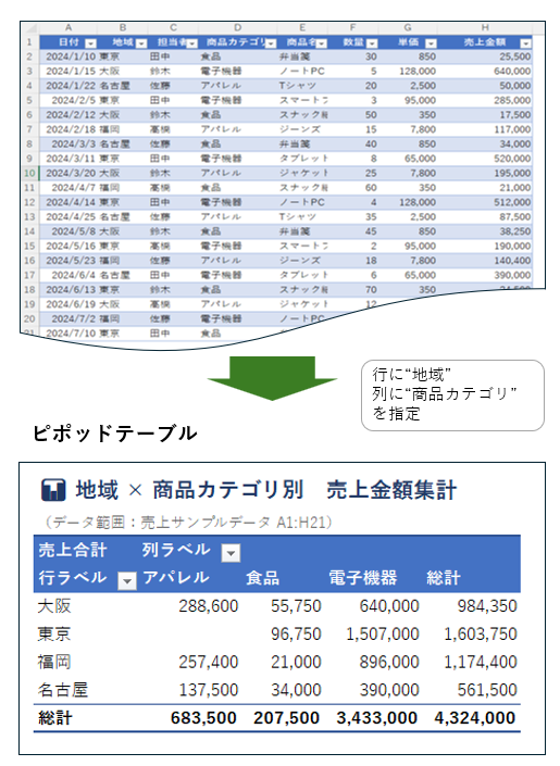 「Pivot(ピボット)」という言葉は「回転軸」を意味します。集計表の行と列の項目を自由に入れ替えることで、分析の視点をぐるりと変えることができます。たとえば「商品カテゴリ別の売上」から「担当者別の売上」へ、マウス操作だけで切り替えることが可能です。