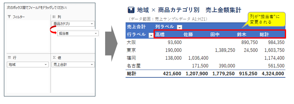 この2点が、業務効率の向上に直結します。たとえば、月次の売上集計表を、項目を入れ替えるだけで支店別の集計表に瞬時に組み替えることができます。