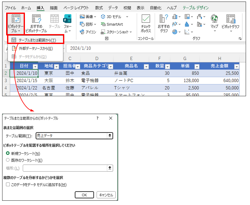 集計したいデータリスト内の任意のセルをクリックします。全範囲を選択する必要はなく、Excelが自動でデータ範囲を認識してくれます。「挿入」タブ → 「ピボットテーブル」を選択し、ダイアログボックスでデータ範囲を確認したら、配置場所は「新規ワークシート」のまま「OK」をクリックします。