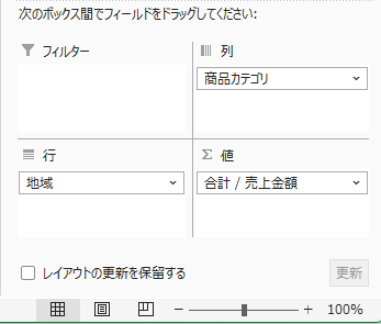 フィールドリストから項目を4つのエリアへドラッグ&ドロップするだけで、集計表が完成します。たとえば「地域別×商品カテゴリ別の売上集計表」を作成する場合、「地域」を行エリア、「商品カテゴリ」を列エリア、「売上金額」を値エリアにドラッグするとクロス集計表が出来上がります。