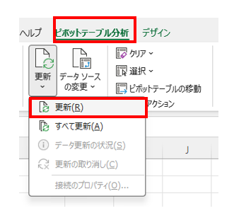 元データに修正があっても、集計結果には自動反映されません。ピボットテーブル内を右クリック → 「更新」、または「ピボットテーブル分析」タブの「更新」ボタンで反映できます。
