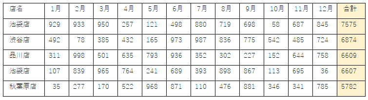 今回は店名と売上合計を太字や黄色を使用し、その他は罫線を薄くし配色もグレー系にすることで、店舗と合計金額が強調され、見やすなったと思います。