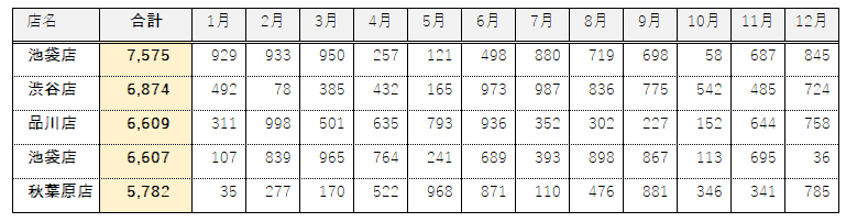 下表はある企業の店舗の売上げを月別に並べた表ですが、見にくくてよく分からないですよね。