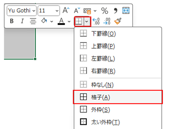 また行やセル自体をクリックし、サイズを設定することも可能です。