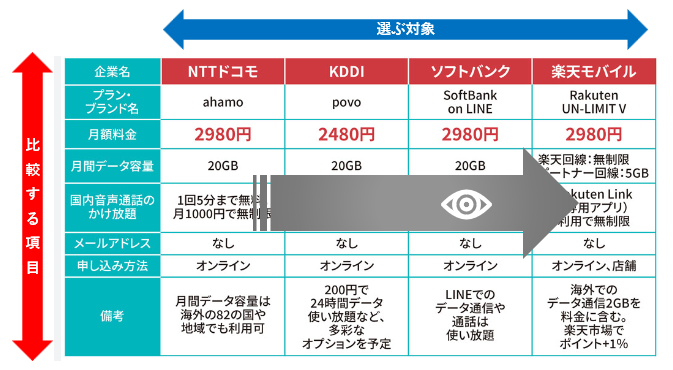携帯会社を選ぶ際に検討する項目の種類や数が多い場合は、横並びがよいでしょう。
