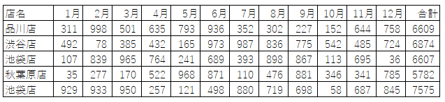 池袋が一番売上が大きくて少ないのは秋葉原店とわかりますね。