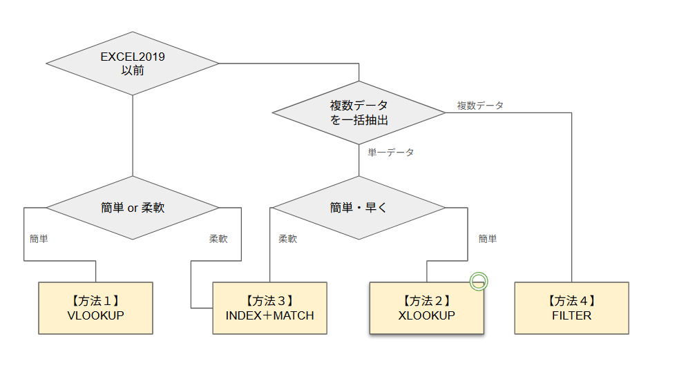 まず使用しているExcelバージョンで絞り込みましょう。Excel 2019以前なら「作業列+VLOOKUP」か「INDEX+MATCH(配列数式)」の2択です。Microsoft 365やExcel 2021以降なら、すべての手法が使用可能です。