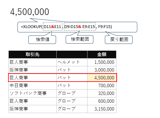 XLOOKUP関数は、引数内で&(アンパサンド)を使い複数条件を直接扱えます。複数の検索範囲を&で結合すると、Excelは内部的にそれらを連結した仮想的な検索範囲を作成します。