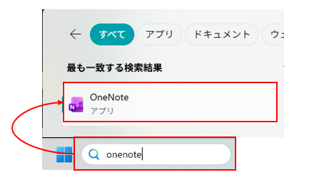 パソコン端末に既にOffice製品がインストールされている場合は、画面左下の検索窓に「onenote」と入力すると、OneNoteアプリが検索結果に出てきますので、クリックすると、「OneNote」のメニュー画面が起動します。