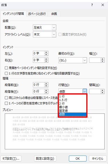 基本的な調整方法に加え、「段落のダイアログボックス」を使うと、数値を直接入力して行間を細かく設定できます。「1.2倍」や「18ポイント」のように指定できるため、厳格な書式が求められる場合に有効です。