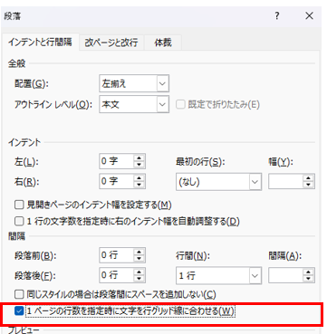 行間設定が反映されない原因として、「1ページの行数を指定時に文字を行グリッド線に合わせる」オプションが有効になっているケースがあります。この機能が有効だと、個別の行間設定が無視されます。