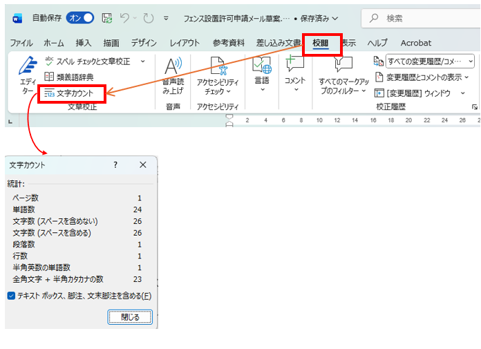 より詳細な情報を得るには、「校閲」タブの「文字カウント」機能を利用します。クリックすると、ページ数、単語数、文字数(スペースを含めない/含める)といった統計情報を示すダイアログボックスが表示されます。