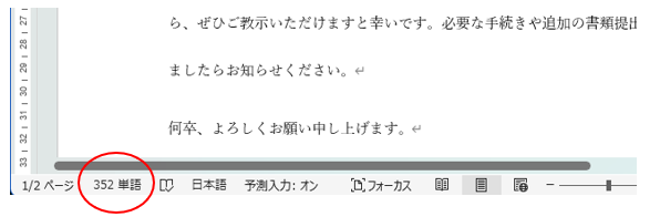 Word文書の文字数を確認する手軽な方法は、画面左下のステータスバーを見ることです。総文字数がリアルタイムで表示され、入力や削除のたびに自動で更新されるため、作業を中断せずに文字数を把握できます。また、文字数部分をクリックすると、詳細な情報を表示する「文字カウント」ダイアログボックスが開きます。