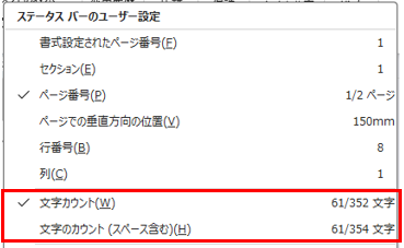 ステータスバーに文字数が表示されない場合、表示設定が無効になっている可能性があります。ステータスバーの何もない領域を右クリックして「ステータスバーのユーザー設定」メニューを開きます。メニュー内の「文字カウント」にチェックを入れると、表示が復活します。