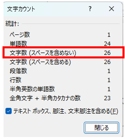 提出要件で「スペースを含まない文字数」が指定される場合など、目的に応じて正確な数値を確認できます。また、ダイアログボックス下部のチェックボックスで、「テキストボックス、脚注、文末脚注」をカウントに含めるかを選択可能です。