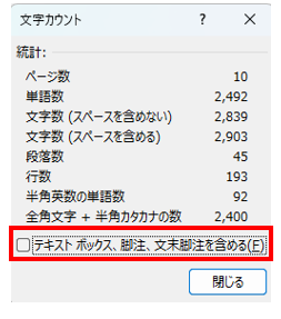 Wordの初期設定では、脚注やテキストボックス内の文字もカウント対象です。カウント対象は「文字カウント」ダイアログボックスで変更できます。ダイアログボックス下部にある「テキストボックス、脚注、文末脚注を含める」のチェックを外すと、これらの要素を除外した本文のみの文字数が表示されます。