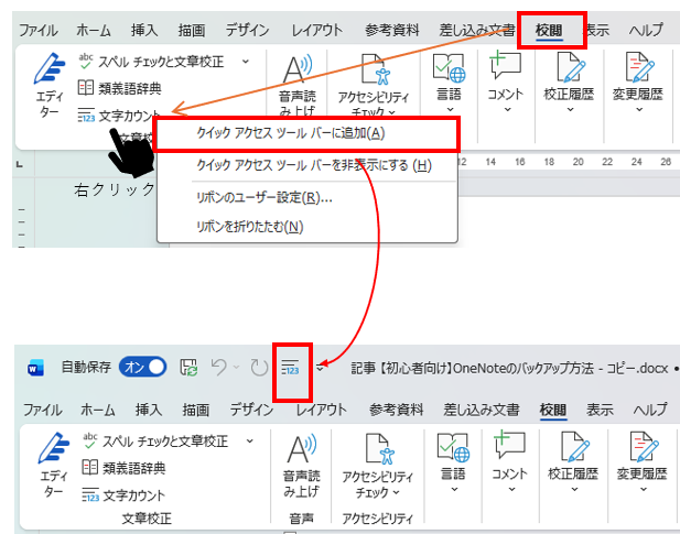 「文字カウント」機能をクイックアクセスツールバーに登録すると、タブを切り替えずに1クリックで呼び出せます。「校閲」タブにある「文字カウント」アイコンを右クリックし、「クイックアクセスツールバーに追加」を選択します。これにより画面左上にアイコンが追加され、いつでも機能を実行できます。