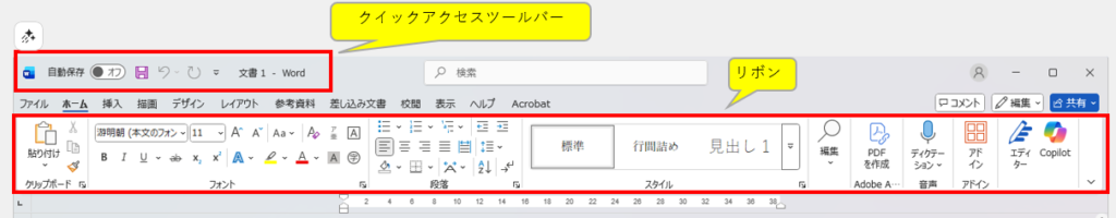 画面最上部には「クイックアクセスツールバー」があり、「上書き保存」など頻繁に使う機能が配置されています。その下には「ホーム」や「挿入」といった「タブ」が並び、目的別に機能が分類されています。タブを選択すると、帯状の「リボン」が表示されます。リボンには、関連するコマンドが「フォント」や「段落」などのグループに整理されています。